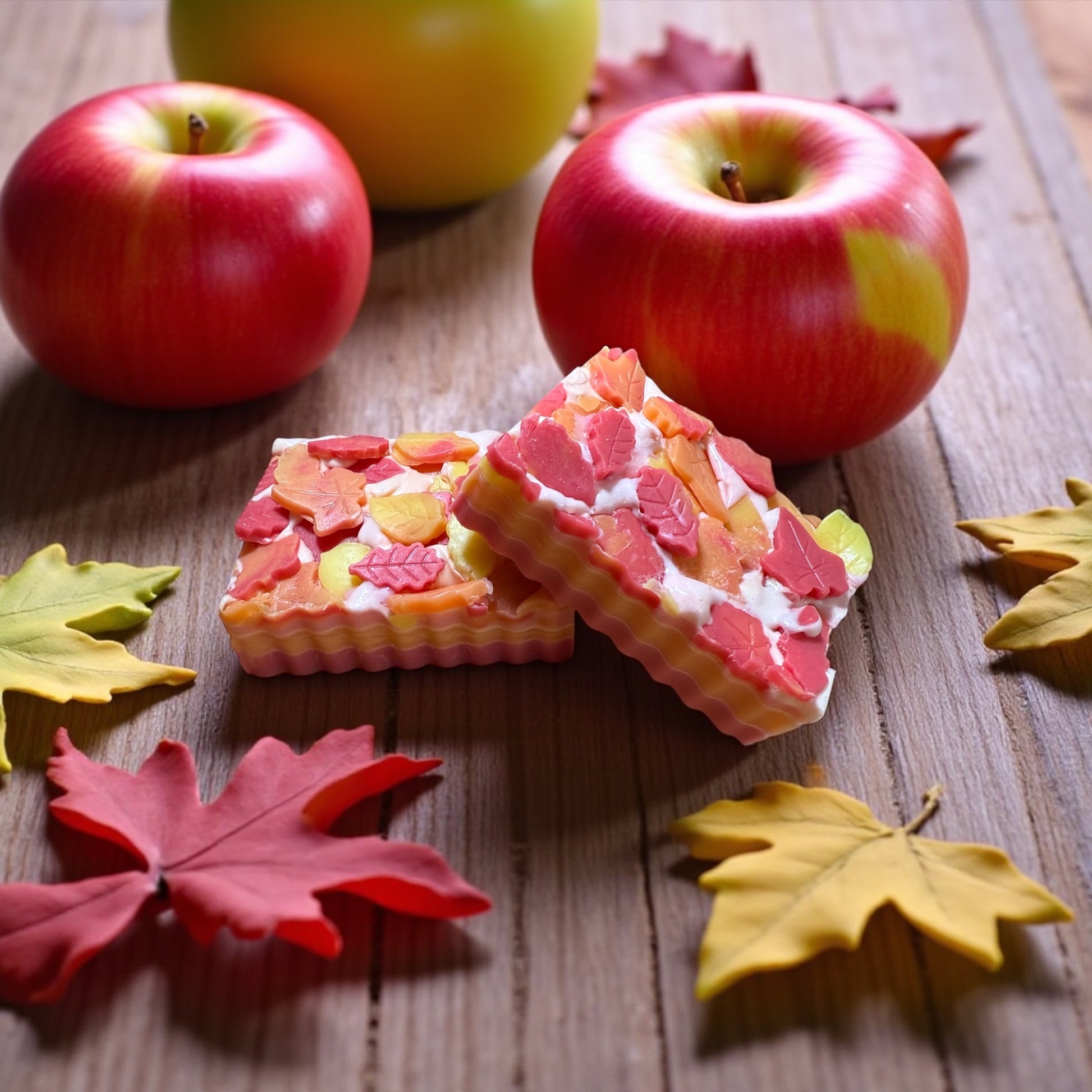 Our Falling Leaves soap smells just like a walk through the falling leaves in an apple orchard. It has a crisp refreshing apple sent along with a fall time breeze. The fun leaf imbeds are so fun, making it look like a pile of leaves!